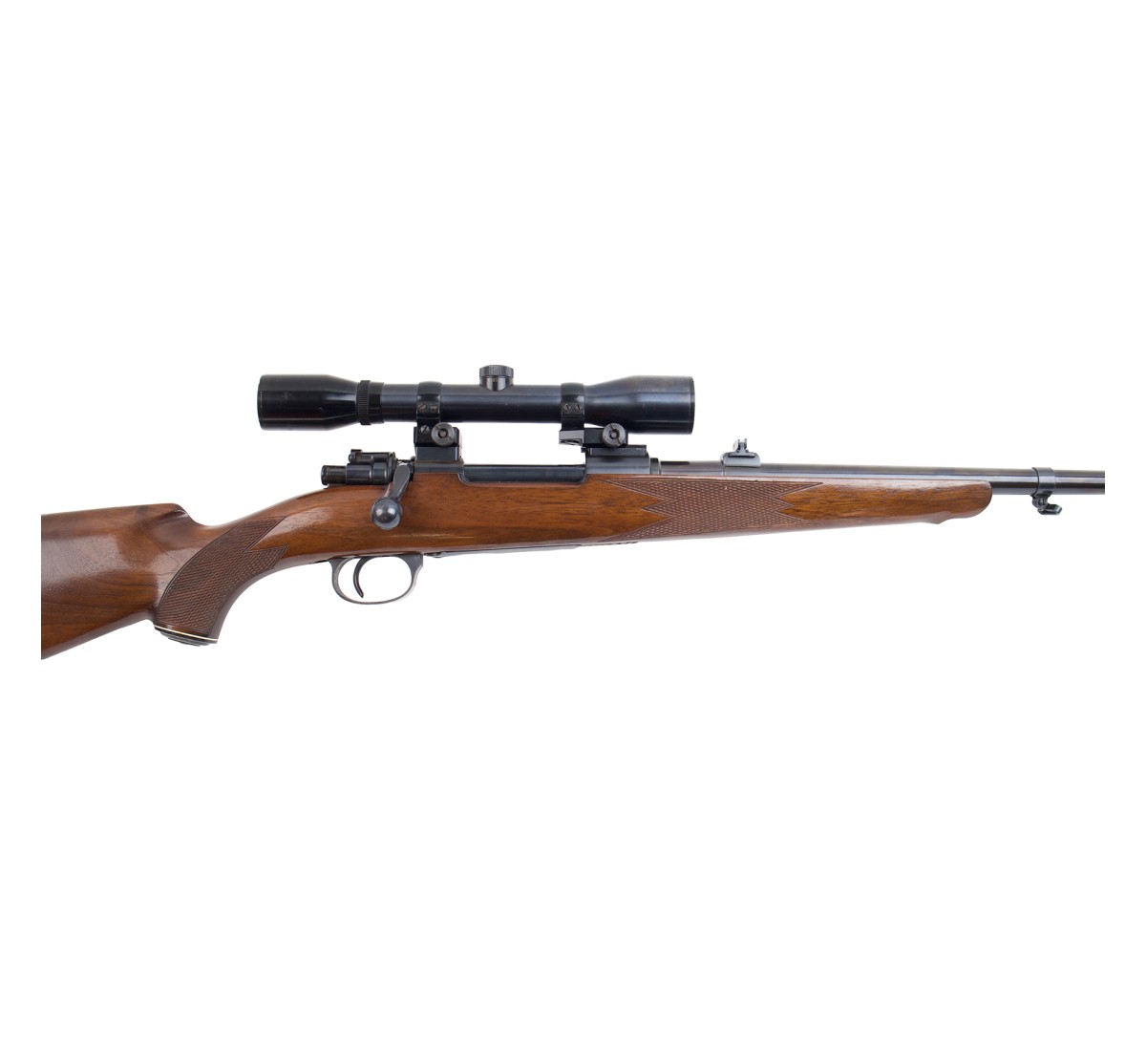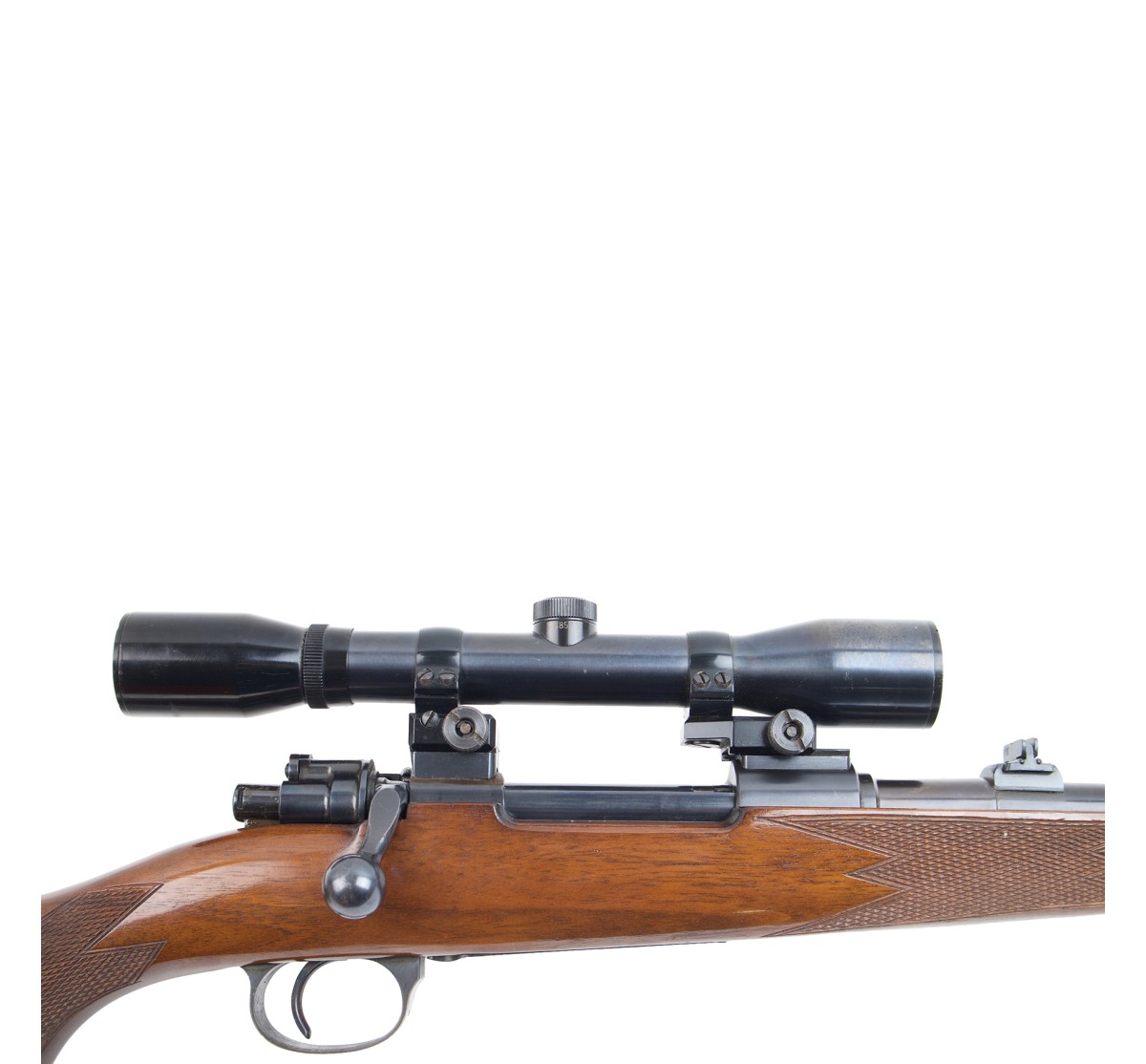 Carabina da caccia con brunitura originale senza punti di sbiancatura evidenti. Monta un'ottica a ingrandimento fisso 4X