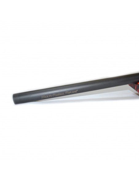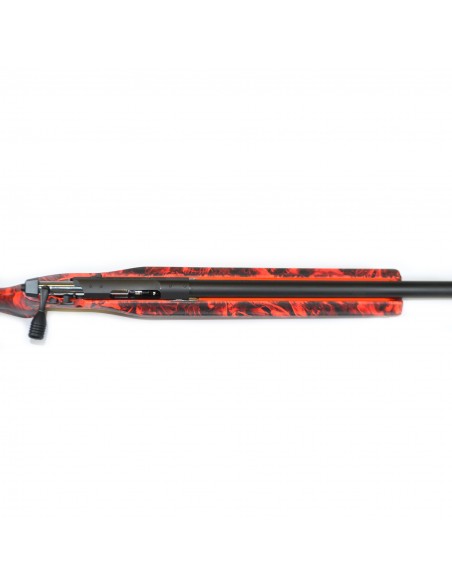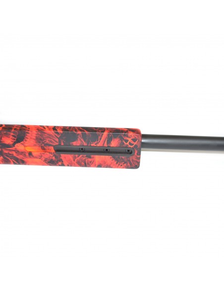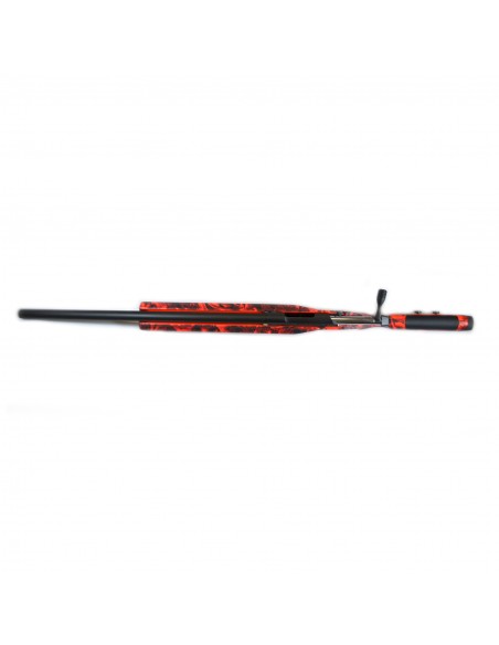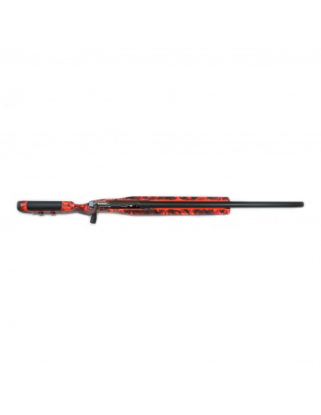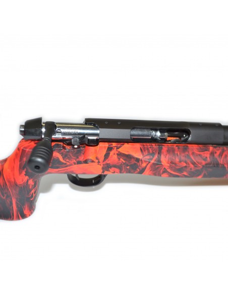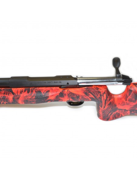 - Arma custom con azione corta, caricatore amovibile, calcio laminato e water transfer rosso e azione e canna brunite.