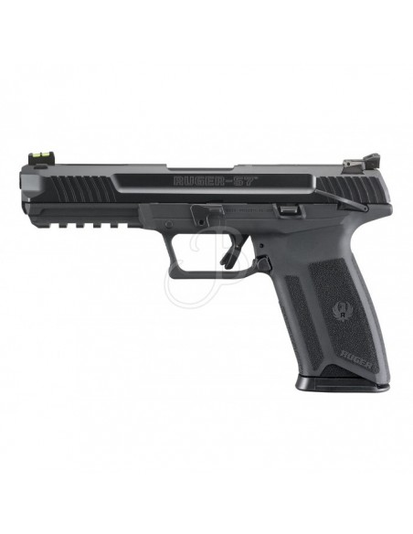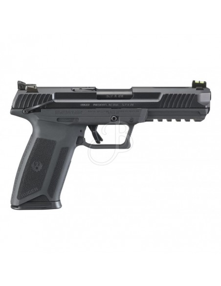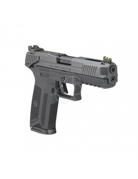 Estremamente ergonomica data dalla posizione del grilletto, dalla sicura manuale ambidestra in stile 1911, dalla robusta leva di chiusura del carrello e dallo sgancio del caricatore reversibile. Carrello in acciaio temprato con intagli laterali per una presa più salda e alleggerimento nella parte superiore. Tacca di mira regolabile e mirino con fibra ottica. La canna in acciaio presenta un trattamento al nitruro nero per una migliore resistenza all'usura. I caricatori in acciaio sono bifilari. Lo scatto Secure Action ™ combina il cane interno affidabile e collaudato di Ruger con un grilletto corto e preciso. Smontaggio facile e sicuro senza attrezzi. Sul fusto c’è una guida Picatinny per montare accessori.