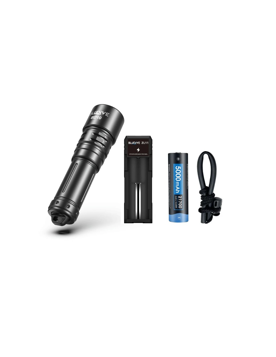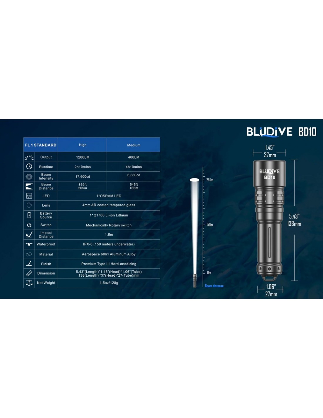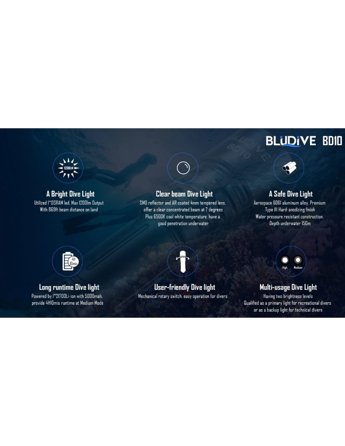 Die Bludive BD10 ist eine handliche Tauchlampe mit mechanischem Drehschalter. Dieser Drehschalter gewährleistet hohe Zuverlässigkeit unter Wasser. Dank der OSRAM-LED erreicht sie eine maximale Lichtleistung von 1200 Lumen, während die Farbtemperatur von 6000 K für eine hervorragende Farbwiedergabe sorgt. Mit einem 21700-Lithium-Akku beträgt die maximale Leuchtdauer 2 Stunden und 10 Minuten. Die robuste, wasserbeständige Konstruktion, die hohe Portabilität und die einfache Bedienung machen die BD10 sowohl für Sporttaucher als Hauptlampe als auch für Tieftaucher als Backup-Lampe geeignet.