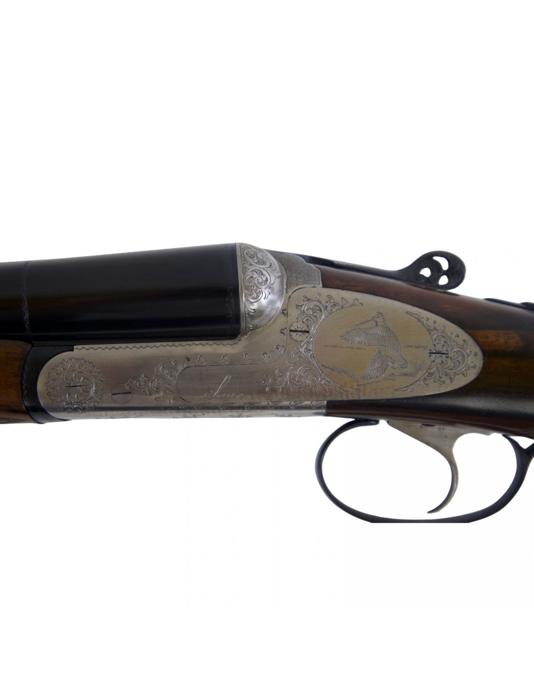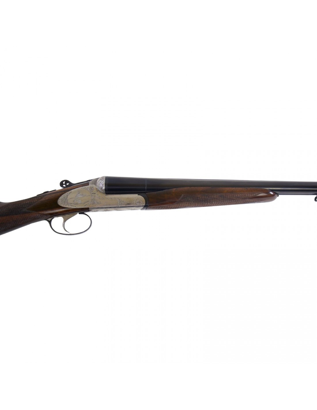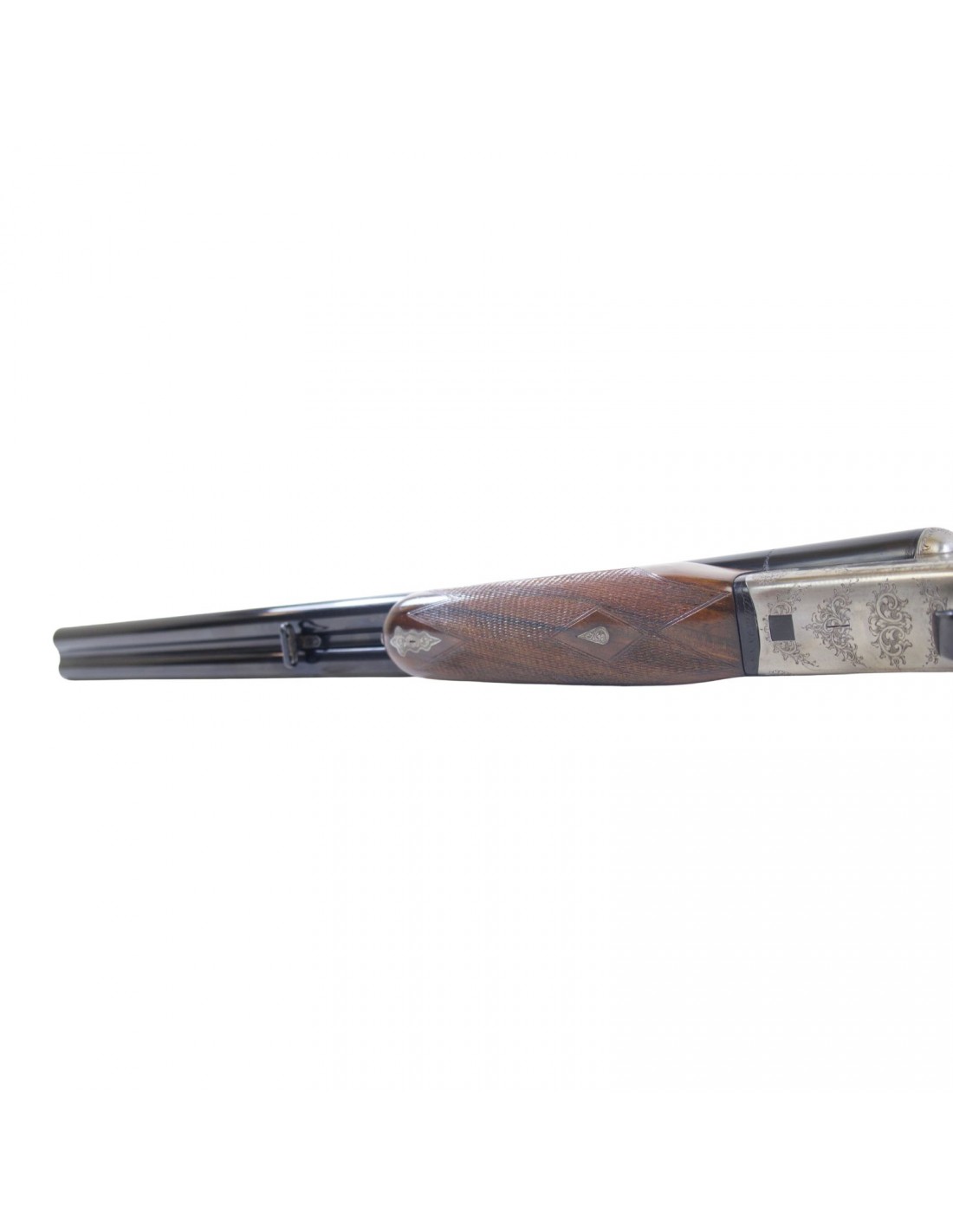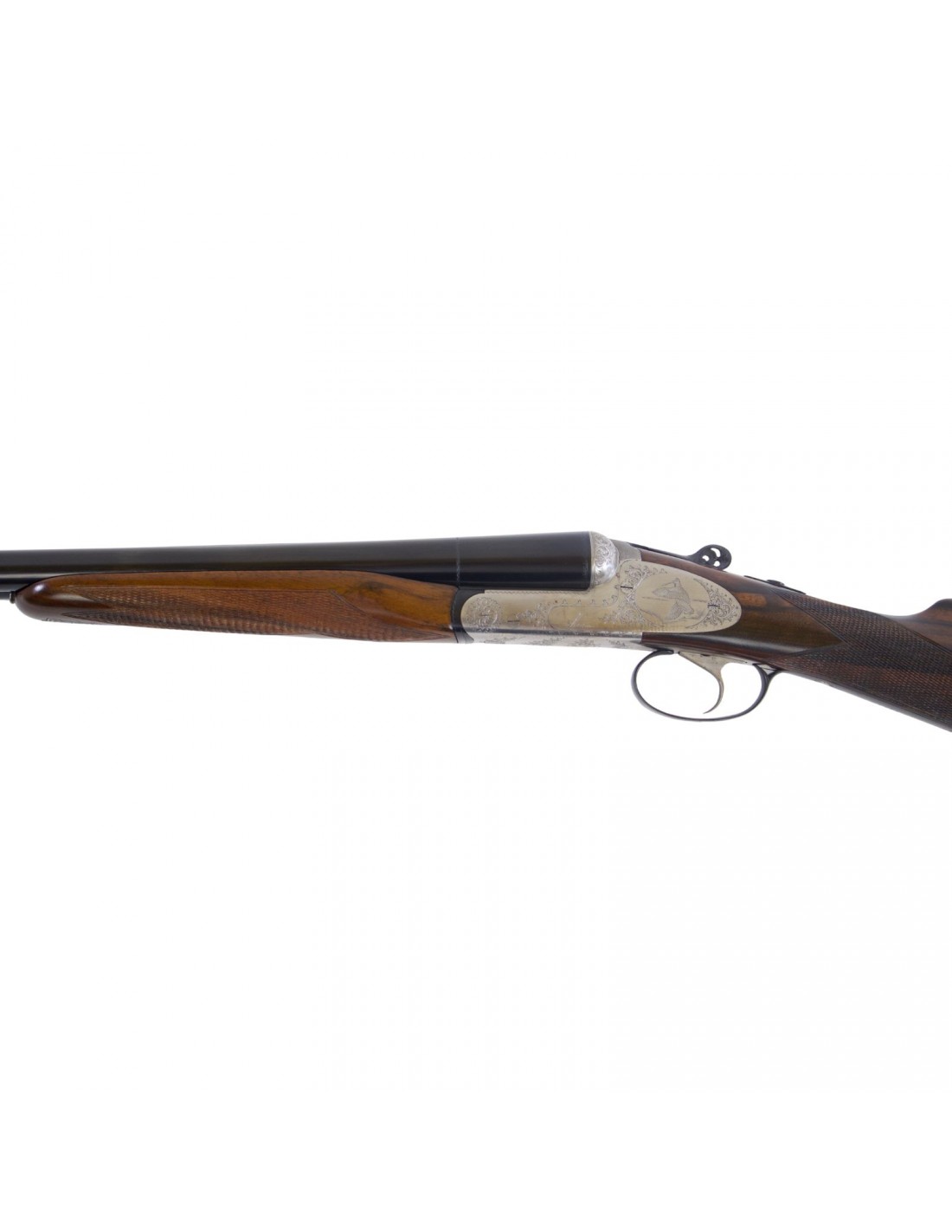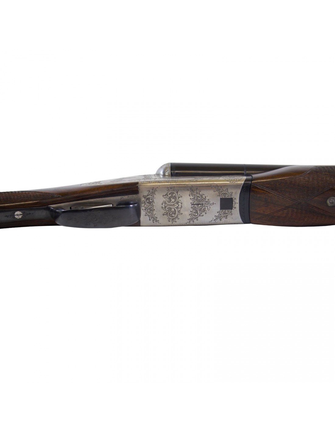 Bellissima doppietta da beccacce con monoblock, cartelle lunghe incise a mano, con ricche incisioni sulla bascula. Meccanica eccellente. Sottocanna 'a castoro' con scudetto porta iniziali. I particolari del sottocanna sono riccamente incisi.