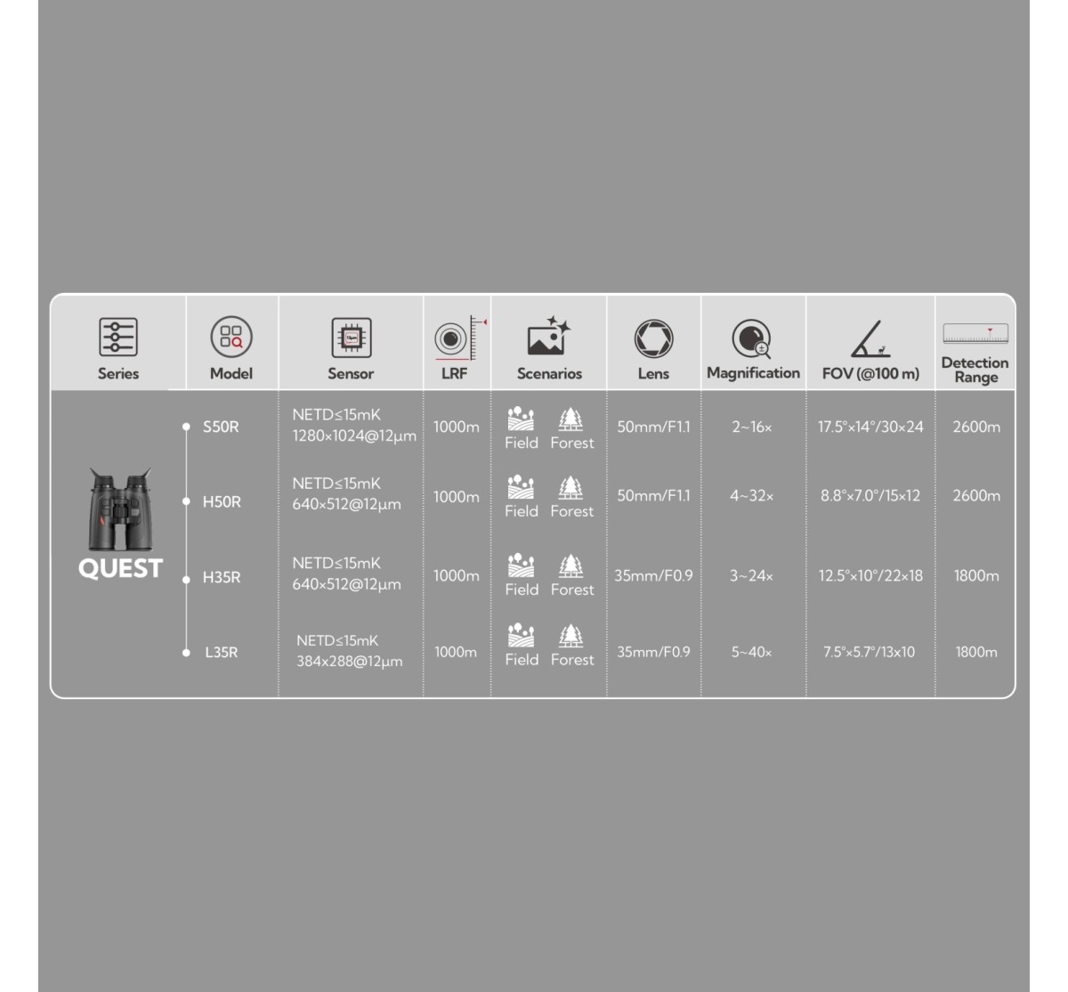 With a detection range of up to 2600 meters, the QUEST H50R allows users to locate targets at extended distances.