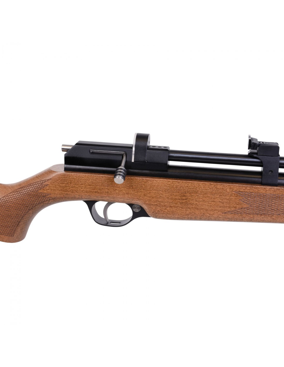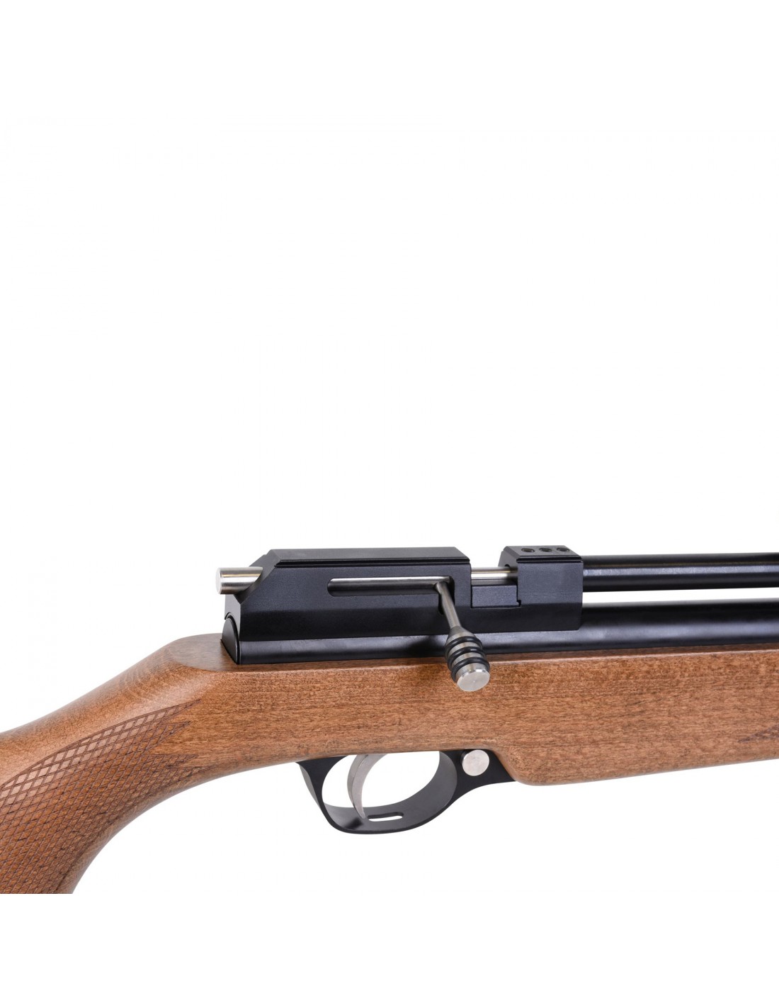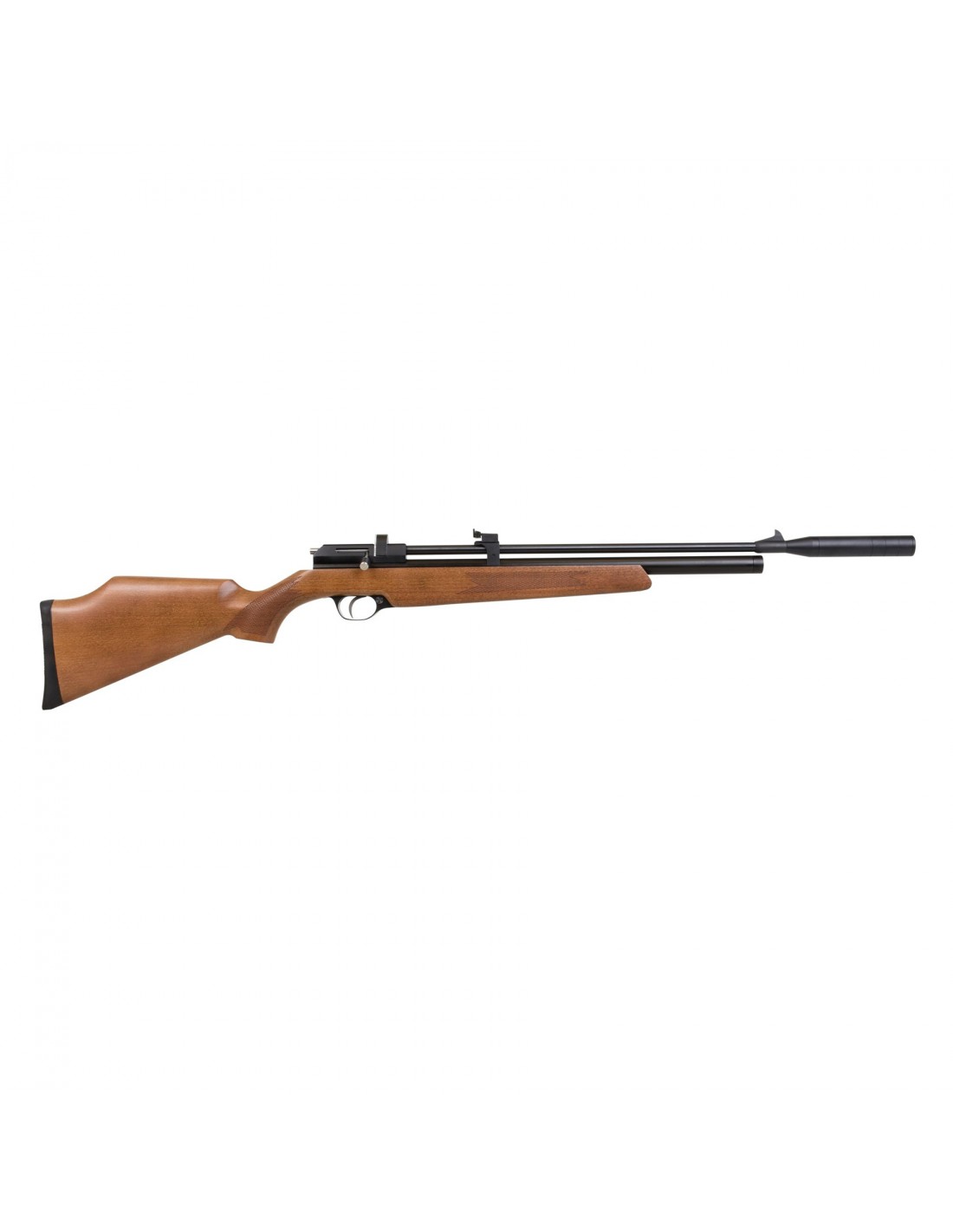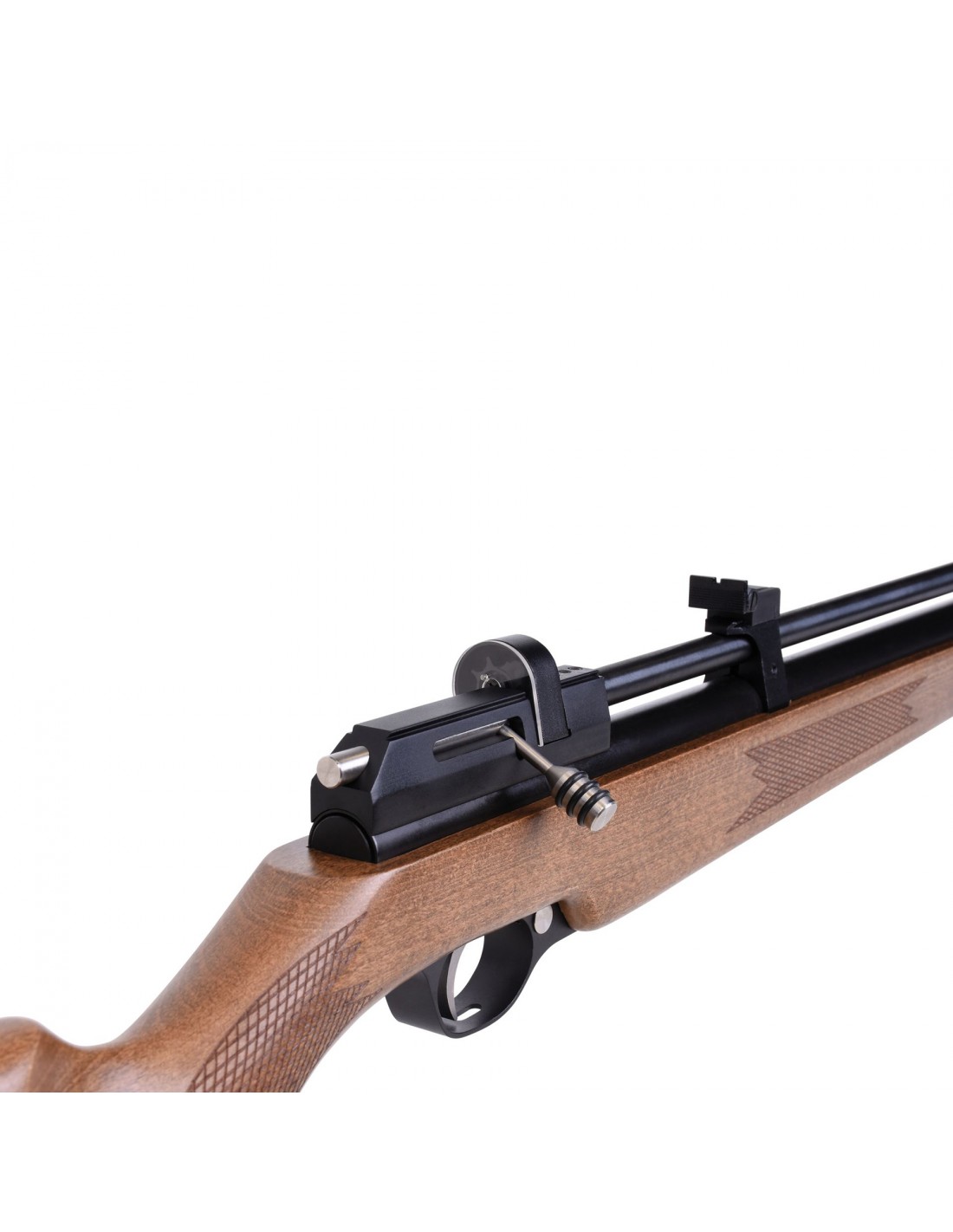 Questa carabina ad aria compressa può essere usata sia in modalità monocolpo che con il caricatore a tamburo da 7 colpi incluso. Il regolatore è integrato, la pressione massima di riempimento è di 200bar. È dotata di slitta fresata, mira micrometrica regolabile, calciolo in gomma e sicura manuale. Nel caricatore possono essere inseriti diabolo fino a 8,6mm.