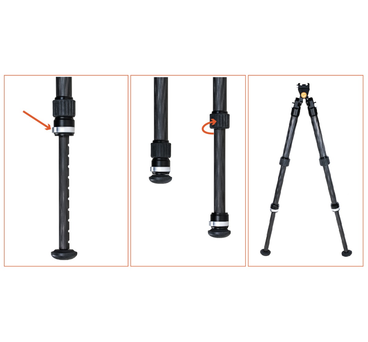 Il bipiede Elevate Ti offre un'inclinazione di 120 gradi e 3 posizioni di apertura delle gambe. Questa combinazione offre stabilità, resistenza, ampia gamma di regolazione dell'altezza e ottimizzazione per qualsiasi terreno senza pari. Gli aggiornamenti del design dell'Elevate Ti consentono di triplicare la resistenza e il supporto complessivi.