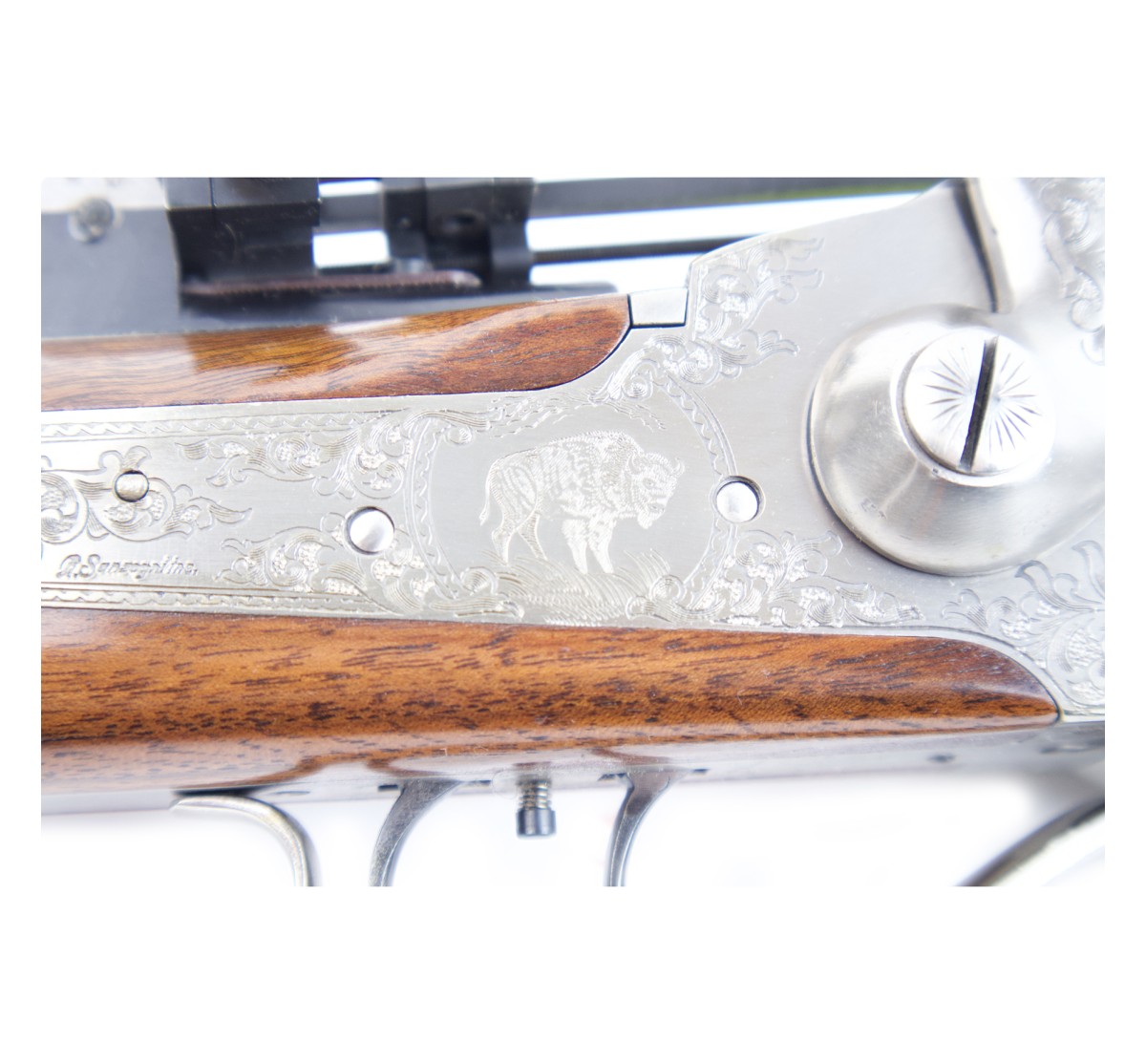 Si tratta di una magnifica riproduzione della carabina Sharps 1874, con retrocarica tramite meccanismo a leva, che funge anche da guardia per il grilletto. È dotata di scatto regolabile bigrillo con stecher. L'arma presenta finiture di pregio, con incisioni sul castello. Nate originariamente come armi per la caccia al bisonte, le carabine Sharps, per la loro potenza e precisione divennero tra le armi simbolo della conquista del west.
