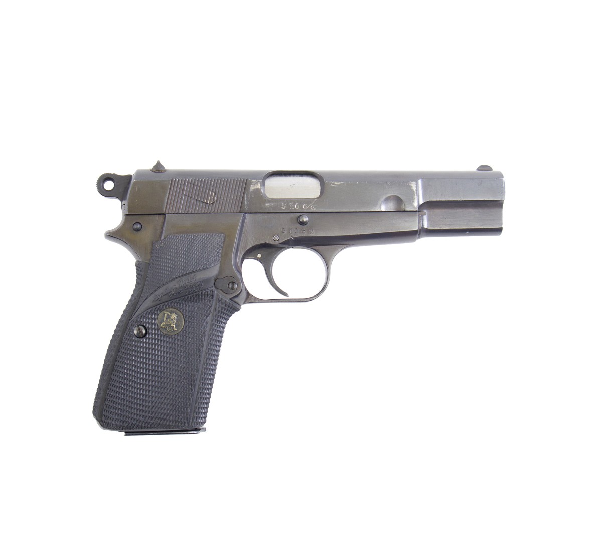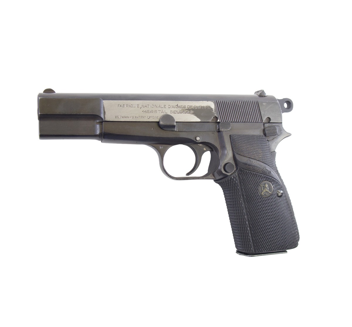 Browning HP prodotta in Belgio sotto occupazione tedesca durante la seconda guerra mondiale. Questo esemplare presenta i punzoni di accettazione della Wehrmacht e dell'ispettorato militare (W&A 140). La canna e le guancette sono state sostituite.