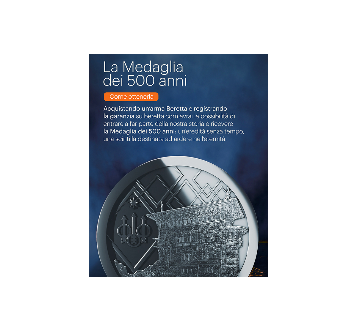 Cogli l’occasione unica di ricevere la medaglia del 500° anniversario, simbolo di un’eredità senza tempo, una scintilla destinata a durare per sempre. Come parte della nostra famiglia, hai il privilegio di ricevere un simbolo eterno dei 500 anni di Beretta.