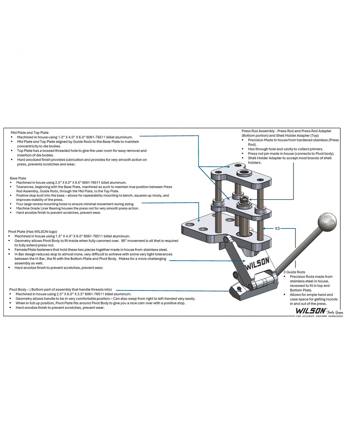 La Wilson Single Stage Reloading Press è una pressa di ricarica monostadio di alta precisione, progettata per chi cerca affidabilità e ripetibilità in ogni ciclo di ricarica. Realizzata interamente negli Stati Uniti con componenti in alluminio billet anodizzato e acciaio inossidabile, garantisce robustezza, lunga durata e prestazioni consistenti per dimensionamento, inserimento primer e seduta proiettili.
